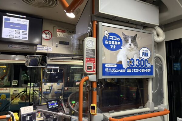 バスの車内に掲載する広告になります。窓ステッカー、窓上ポスター、メモリーブザー、天吊り広告など、さまざまな形式があり、複数の広告を組み合わせて利用することも可能です。乗客に対して効果的に訴求できる広告となっています。